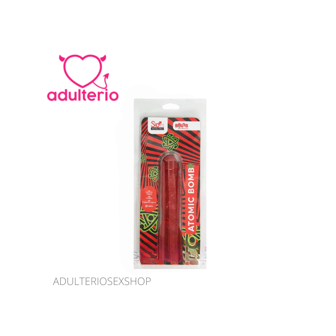 Dildo Atomic Bomb con copa de succión fuerte que se adhiere a cualquier superficie plana, hecho de material libre de ftalatos. Forma y textura realista, compatible con cualquier tipo de arnés.